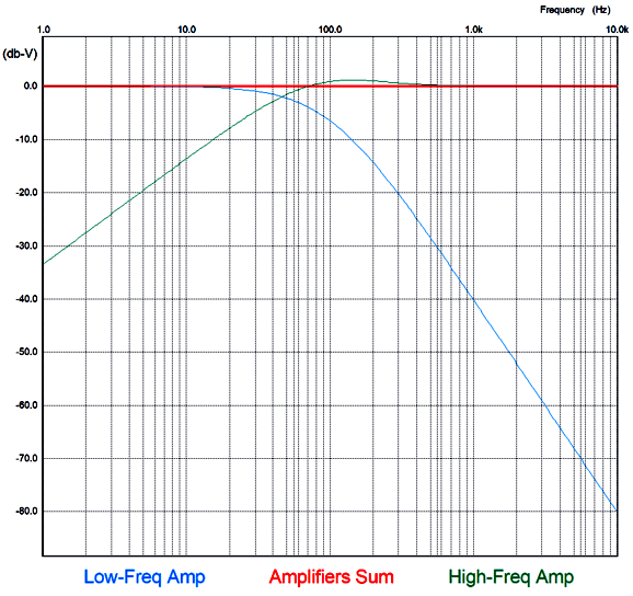 Interestingly enough, these 1st-order filters are freebies of sorts. How so? They do no produce any additional phase shift. as a 1st-order crossover sums to unity and is phase flat. In other words, although the two amplifiers see a truncated bandwidth, the signal arriving at the loudspeaker is identical to that produced by the previous circuit without the filters. SPICE simulations bore this out.