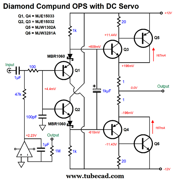 We can use the internal diodes, along with the diamond's self-correcting immunity to temperature shifts, to create an auto-bias scheme. Once again, transistors Q1 & Q3 and Q2 & Q4 must tightly thermally track each other, which requires close placement on the heatsink, and should be of the same kind—no mixing and matching allowed. As the output transistors, Q5& Q6, heat up, their base-to-emitter voltage falls, but then so, too, does the diode's voltage drop, so the idle current remains fairly constant. Okay, let's flesh out the design.