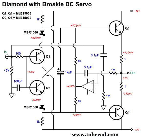 The DC servo's output follows the input signal, which in the circuit above prevents the diode from becoming forward biased under normal operation, but allows the diode to engage when the triode is cold and not yet conducting or is missing from its socket. Applying the servo to the diamond is easy enough.