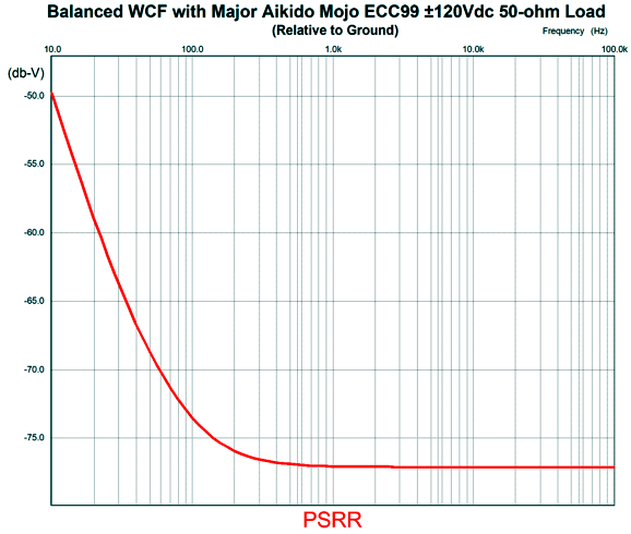 In the previous design example, we saw a B+ voltage of 200Vdc; here we see ±100Vdc. The top 154-ohm current-sense resistor establishes balanced push-pull operation with the same intended load impedance of 300-ohm headphones. This time the cynosure resistor needed to be 11 ohms and its terminating capacitor had to be 180µF. The coupling capacitor that bridges the current-sense resistor to the bottom triode's grid is now only 0.1µF. Here is the SPICE-generated PSRR graph.