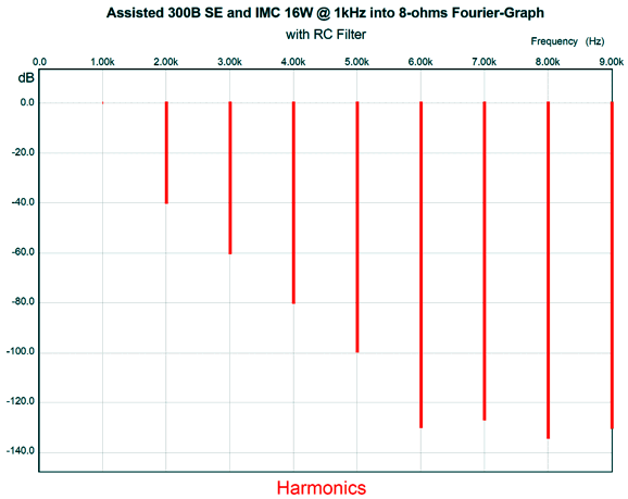 I then fed this input signal into the IMC circuit and beheld almost no diminution of sonic glory, as the output overlapped nearly perfectly with the input signal (i.e. the signal created by the faux 300B). First, here is the SPICE-generated Fourier graph for just the faux 300B output signal.