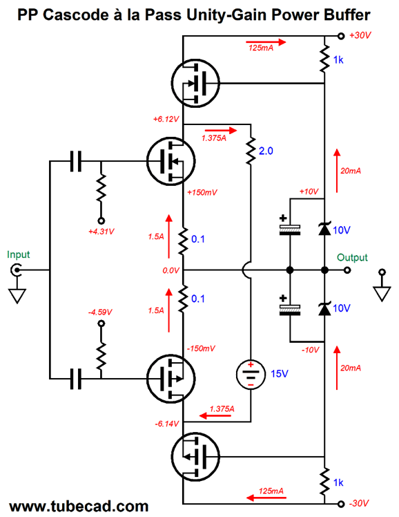 Note the absence of an input coupling capacitor and of the capacitor that normally terminates the negative feedback loop's 1k resistor. In other words, this is a DC-coupled power buffer, which will pass along any DC offset voltage at its input. Is this a big problem? No. The class-A unity-gain power buffer is responsible for eliminating any DC offset, so it little matters if its bipolar power supply voltages do not center at ground potential. What we need now is the class-A unity-gain power buffer. One idea that comes to mind is the compound arrangement.