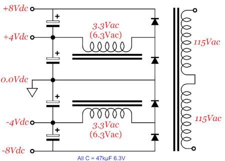 From 0V to either -8Vdc or to +8V, we have full-wave rectification; from 0V to either -4Vdc or to +4V, we have half-wave rectification. Note that the same power transformer is being used, not three inductors. To get the two higher power-supply rail voltages, we use another power transformer with higher secondary voltages, but in the same rectifier topology. The 23Vac secondaries are nominally 22Vac secondaries, but we use the same 120Vac wall-voltage trick to up the voltages, as 22 x 120/115 = 23.