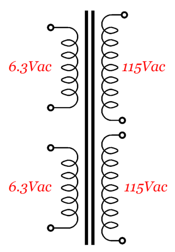 Note the dual primaries and dual secondaries. Also note the 115Vac primaries. Where I live, my wall voltage is 120; my friend's wall voltage in Northern California, 122Vac. This power transformer plugged into my wall socket yields 6.3 × 120/115 volts (6.6Vac) secondary voltages. If we place the two primaries in series, we halve the secondary voltages. If we place the two primaries in series and connect them to a 120Vac wall voltage, we get two 3.3Vac secondaries, which rectify up to 4Vdc, assuming about a 0.7V rectifier voltage drop.
