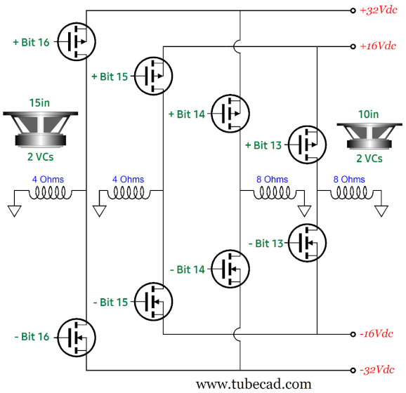 Imagine a relatively small subwoofer enclosure 18 inches square and 22 inches tall. This subwoofer contains two drivers, a 15in woofer and an 8in woofer. The analog input signal (say, 1Vpk) passes through a steep low-pass filter before entering the 16-bit ADC. The first 12 bits of lesser significance digital output are fed to the 12-bit DAC and the DAC's analog output signal feeds the 8-inch woofer's internal analog (i.e. linear) power amplifier. The power DAC gets the last four bits, the most significant bits, so the 15-in woofer may not be engaged at all at low volumes or with music with little deep-bass content. The 15-inch woofer must hold four voicecoils, not one or two, but four. Each voicecoil presents 4 ohms of impedance. Such a subwoofer woofer driver is not currently being made, but it easily could be, as the process that creates dual voicecoils is simply doubled. Each 4-ohm voicecoil is driven by its own internal 3-state power circuit, all of which attaches to a multi-voltage bipolar power supply, whose rail voltages are -32V, -16V, -8V, -4V, 0V, +4V, +8V, +16V, and +32V.