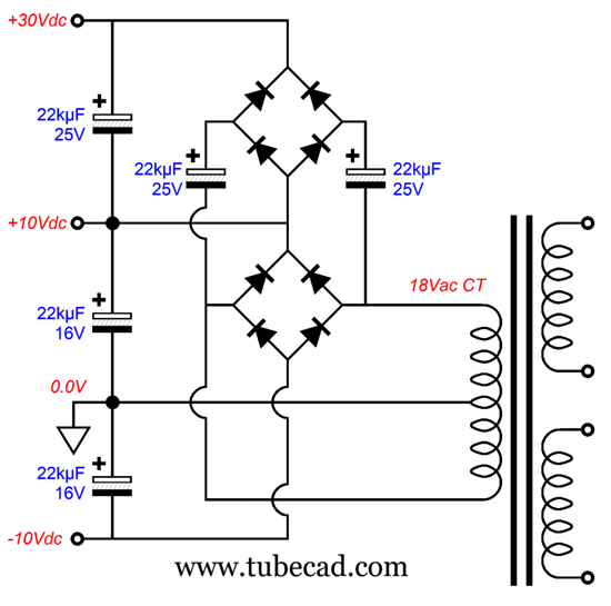 Two bridge rectifiers and five capacitors along with a center-tapped power transformer are all that is needed. Still, a more conventional and congenial power supply is the symmetrical bipolar power supply, which we could use with this design with the addition of a second constant-current source.