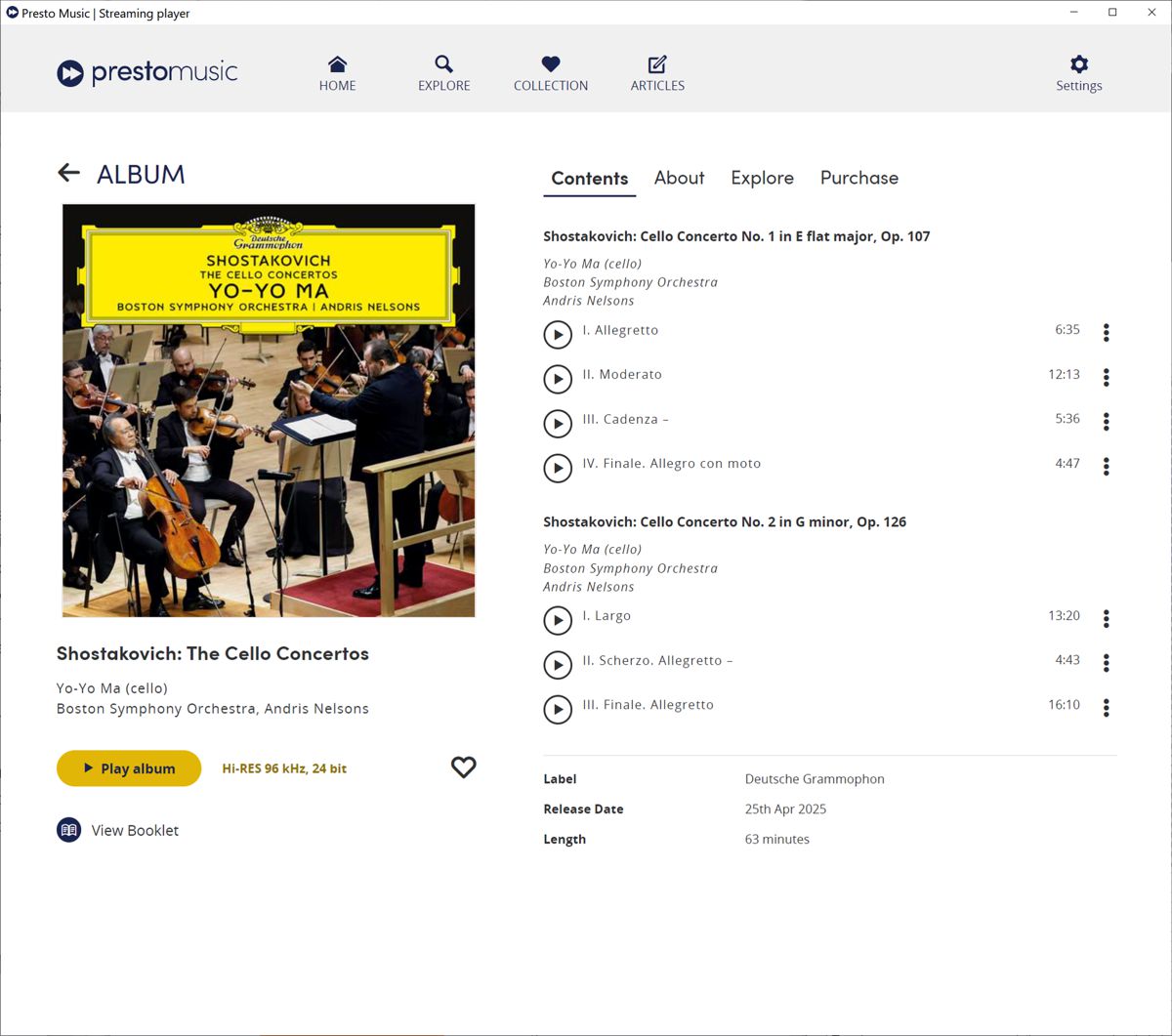 The best question to ask is does Prestomusic offer any more or any higher resolution versions of albums than Amazon Music, whose catalog, behooving its Amazon parentage, is simply staggeringly huge? I have found some examples. Prestomusic offers all five of their United Strings of Europe albums in 24-bit, 192kHz, whereas Amazon Music offers the same five albums, but only one is 100% unalloyed 24-bit, 192kHz, the others hold a mix of 24-bit, 192kHz and CD resolution tracks. (Amazon Music seems to offer 14 albums by this ensemble, but Amazon seems to not understand the distinction between an album and a single.) Another feature is that Prestomusic claims to return more money to the actual music creators than the competing music streamers, with payments based on per second rather than per track. "Claims" was added due to there being some dispute over whether in practice this extra fair outlay is true. I hope it is. I wish that all music-streaming services offered a tip jar with every artist, so I could send directly a cash tip to the artist, which would be added to my monthly bill.