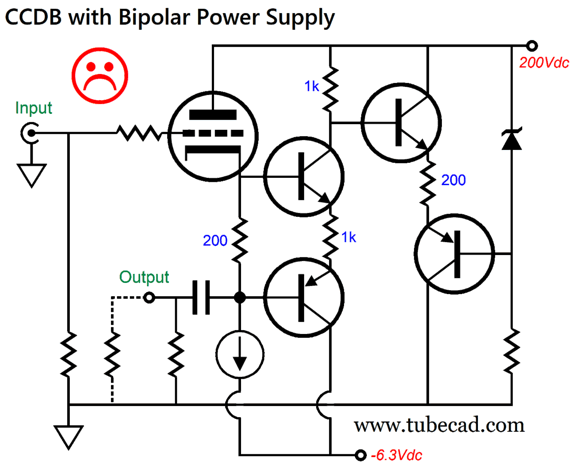 The problem with this workaround is that the constant-current source is located at the bottom, not the top of the triode. In other words, this is not a CCDB. Next, we see my first attempt at making a CCDB.