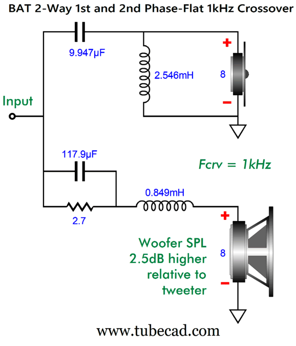 The tweeter's SPL has been reduced by 2.5dB due to the 2- and 24-ohm resistors, thereby undoing the-2.5dB insertion loss that the woofer undergoes. And the same topology, but with the following enhancement: