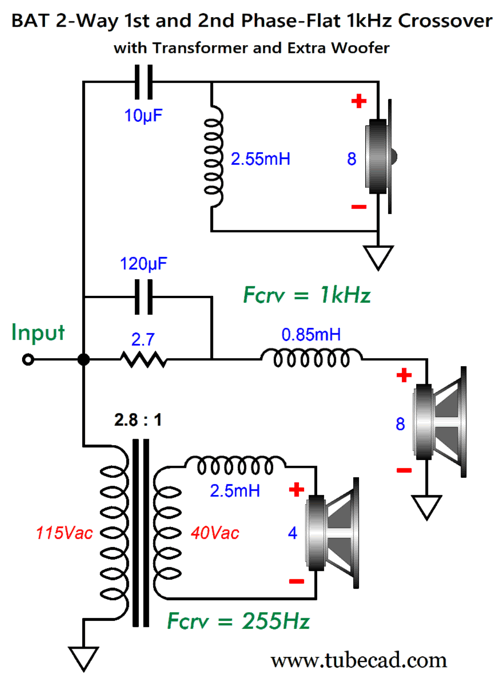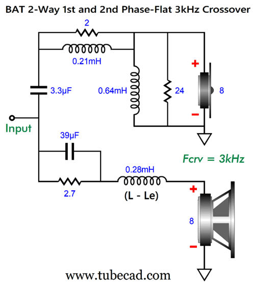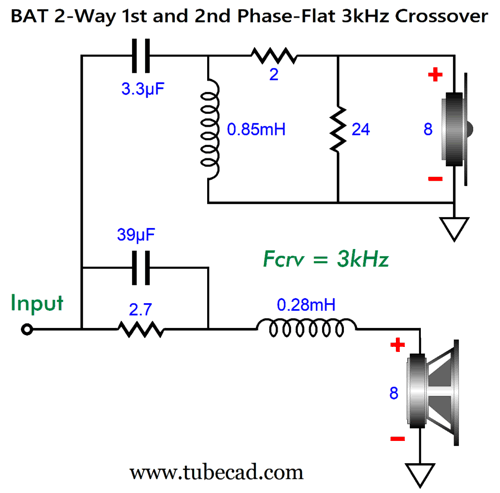Why? Perhaps you have noticed that many of the most highly esteemed (and expensive) loudspeakers now sport rear-firing tweeters. The reason behind this added expense and hassle is that the sound improves. Back in the previous century, listening tests were conducted to discern which loudspeakers sounded best. One finding was that the more closely the reflected sound's bandwidth matched the direct sound's bandwidth, the higher the loudspeaker approval rating. (Of course, a rear-firing tweeter on a bookshelf loudspeaker or a corner horn loudspeaker will not do any good.) This finding helps explain why electrostatic and dipole planar loudspeaker are so valued. Next, my attention was drawn to the BAT phase-flat crossover's use of a 2.7-ohm resistor in the following schematic.