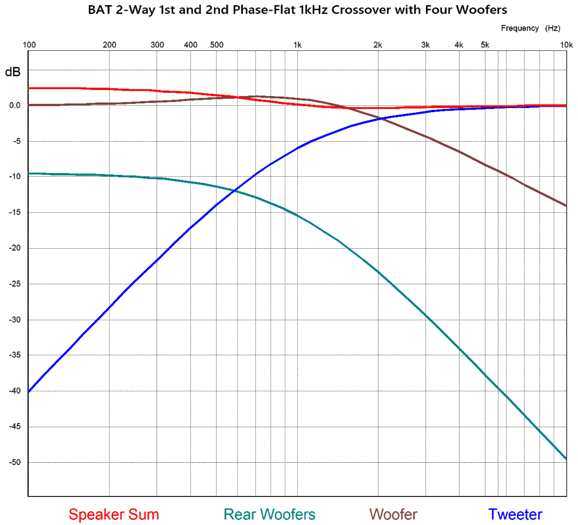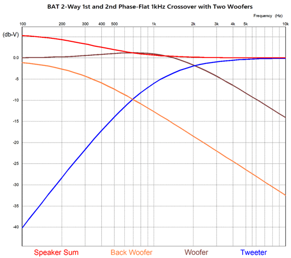 This SPICE-generated graph shows the electrical signals delivered, but not the actual acoustical output, as the three added woofers will offer a 9.5dB boost in SPL due to the threefold increase in radiating surface area. Speaking of reality, the tweeter must offer 2.5dB less SPL than the front woofer. The modified following graph is closer to reality.