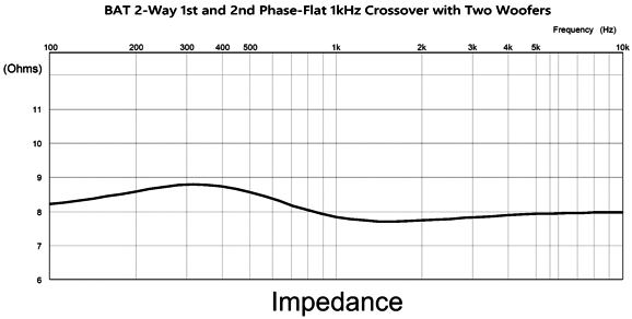 Better, but not perfect, as I do not believe that the dip in the midrange will actually obtain. Why not? The rear-firing woofers' directivity at high-frequencies and the enclosure width are enough to prevent those higher frequencies from meeting up with the front sound radiation. We do get the +6dB boost in the low-frequencies, but since the loudspeaker shifts 180-degree radiation at higher frequencies to 360-degree radiation at low-frequencies, it incurs a -6dB loss at low-frequencies. In other words, flat frequency response results, as long as the loudspeaker is relatively narrow and tall and stands well away from the back wall. I envision using four small woofers or fullrange drivers, say 4in to 5in in a cabinet 8-inches square by three to four feet tall. The tweeter could be an AMT or planar driver. So have I ringed the last drop from this crossover topology? Not likely. An odd feature (or liability) of this topology is that it creates a non-flat impedance plot, as the impedance rises at low-frequencies.