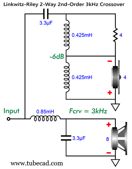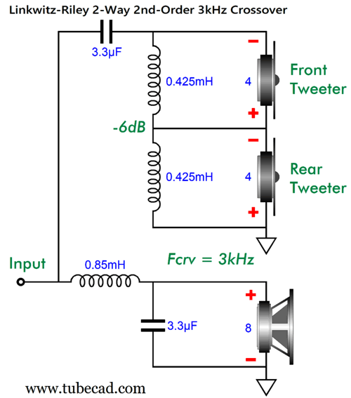 (Note the phase reversal on the tweeter; the Linkwitz-Riley crossover is not phase-flat.) The 8-ohm resistor shunting the 8-ohm tweeter creates a 4-ohm resistance. Well, what if we used a 4-ohm tweeter instead and lose the 8-ohm resistor?