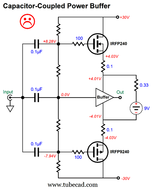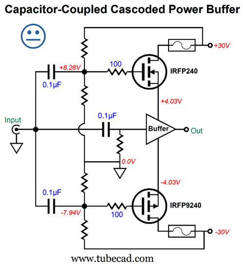 Note that the output stage drives the cascode MOSFETs via the two zener diodes. The extra load presented, 1k, by this bias arrangement is trivial compared to the 8-ohm loudspeaker, but what does worry me is that the single-ended buffer's departure from the input signal will also be imposed upon the cascode MOSFETs' output. This got me thinking about adding two extra input coupling capacitors and letting the input signal drive the cascode MOSFET directly.