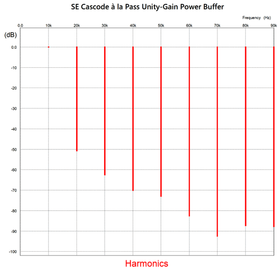 The 300-input resistor represents the output impedance from the tube-based input stage not shown (an Aikido gain stage with a 12AT7 or 12AX7 or 5751 input tube and an ECC99 output tube). The center IRF MOSFETs draw 3.2A at idle, while the cascode MOSFETs draw 50mA each. The center power buffer dissipates 25.7W at idle, while the entire power buffer dissipates 34.2W. Not bad, especially when we consider the single-ended harmonic structure of the output. Speaking of which here is the SPICE-generated Fourier graph for 36W of output at 10kHz into an 8-ohm load, without the tube-based input stage.