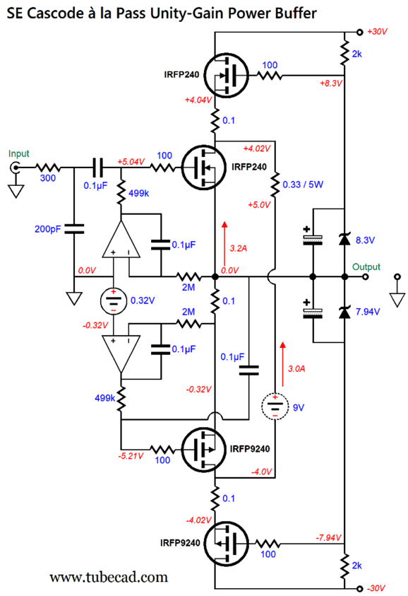 The top OpAmp sets the cascode MOSFET idle current by monitoring the voltage drop across the 3-ohm resistor. (This resistor need not be a high-wattage type, as the worst case scenario is that it experiences a 0.6V voltage drop, as the resistor is shunted by the MUR420 rectifier that effectively acts as a 0.6V zener.) The bottom OpAmp centers the cascode MOSFETs. All the 2M resistors must be tight tolerance types, say at least 1%, preferably 0.1% types.