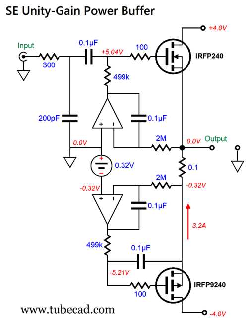 The cascode MOSFETs have been doubled up to reduce individual dissipation and excessive voltage drop across the 0.1-ohm source resistors. The floating 9V power supply gets an RC capacitor in the added 1kµF electrolytic capacitor, which will banish the high-frequency ripple from the switch-mode power supply. Note the change in the servo resistor values, 1M versus 499k. Why? If the center power buffer is DC coupled at the input, we use 499k resistors, but with a coupling capacitor, we use 1M resistors, which creates a high-pass filter Q of 0.5.