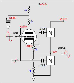 The +1 Volt pulse also decreases the voltage across the cathode resistor, which in turn decreases the current through this resistor, which will also decrease the current flowing through the plate resistor, as both are in the same current path. Since the top of the plate resistor is fixed and cannot move the plate must move up one volt to make up for the one volt loss across the plate resistor. This means that the pulse applied to the output is relayed to the bottom output device via the coupling capacitor. Upon seeing the positive pulse, the bottom device will increase its conduction; thus bucking the positive going pulse. A negative going pulse provokes a negative pulse at the plate, which serves to decrease the bottom output device's conduction. When the output is terminated into an 8 ohm load, the output's connection to the bottom of the cathode resistor provides the equalizing drive for the bottom output device. To whatever degree the output voltage lags behind the top output device's input voltage is the degree that the output voltage will subtract from the raw drive voltage to the bottom output device. For example, if 21 volts of drive is needed to bring the output to +20 volts of output, then the top output device sees only +1 volt out of the +21 volts presented to its input. The bottom output device sees its raw -21 volts input signal being reduced by the +20 volts output voltage to only -1 volts. In the circuit below, the a differential amplifier provides voltage gain, while the output devices still function as unity gain followers. Both the bottom and top output devices receive the same magnitude drive voltages, which the zener-capacitor provides.