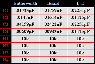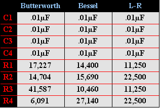The Resistor and Capacitor Values The table below gives all values for the 1st, 2nd, 3rd with one section, 3rd with two sections, and 4th order filters. The base frequency is 1000 Hz. To decrease the frequency, scale either the resistor or the capacitor values down by 1000/F, where F equals the desired crossover frequency. To increase the frequency, scale either the resistor or the capacitor values up by F/1000, where F equals the desired crossover frequency.