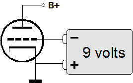 Here is an example that illustrates how little current a grid conducts when it is substantially more negative than the cathode. If a 9-volt battery is connected to a triode so that its negative terminal attaches to the grid and its positive terminal attaches to its cathode, while the cathode is grounded and its plate is connected to a high voltage power supply, the battery's life expectancy would probably prove no shorter than that of its brother still shrink-wrapped at the store. Yet, the battery is an essential part of the circuit.