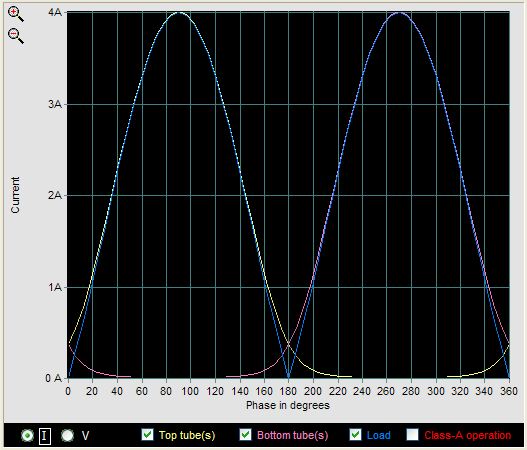 Waveform Graph The output stage's current/voltage dynamics are displayed in this graph. In the example to the right, the load and the output stage's current conductions are shown. The blue plot reveals the absolute current flow into the load. Why take the absolute value? The absolute value allows the current contribution from each tube to driving the load to be more readily seen. When the "Class-A Operation" checkbox is checked, TCJ Push-Pull Calculator displays a red bar that reveals the limits of class-A operation. (By the way, how many readers think that this amplifier is running in pure class-A mode? One, two, maybe three?) |